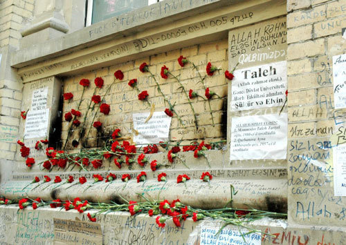 У стен Азербайджанской государственной нефтяной академии (АГНА) в Баку продолжается церемония жертв массового убийства в этом вузе 30 апреля.