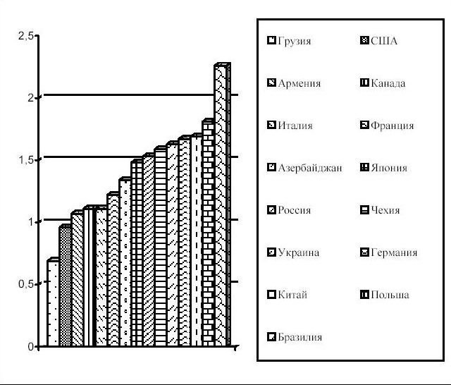Рис. 1. Коэффициент опережения роста экспорта над ростом ВВП за 1995–2005 гг.