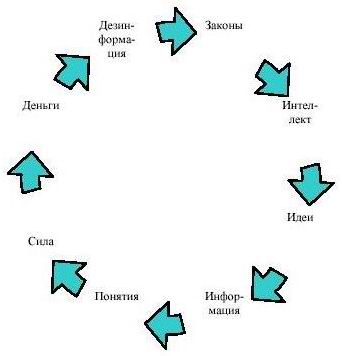 Эта диаграмма применима к странам, в которых превалируют такие понятия, как дезинформация, деньги, сила и понятия, а в идеале должны бы преобладать законы, интеллект, идеи и информация.
