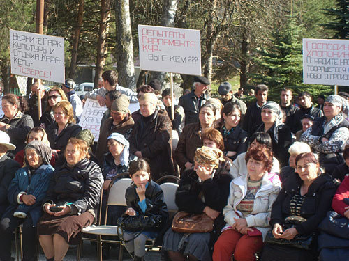 Жители, участвовавшие в митинге, держали в руках плакаты с надписями "Заповедник – достояние народа, а не Айбазова", "Господин Хлопонин, оградите нас от творящегося кланового произвола", "Верните парк культуры и отдыха "Кара Кель" Теберде", "Борис Сафарович (Борис Эбзеев – глава карачаево-Черкесии – прим. "Кавказского узла"), Вы с народом? … или …" "Депутаты Парламента КЧР - вы с кем?".