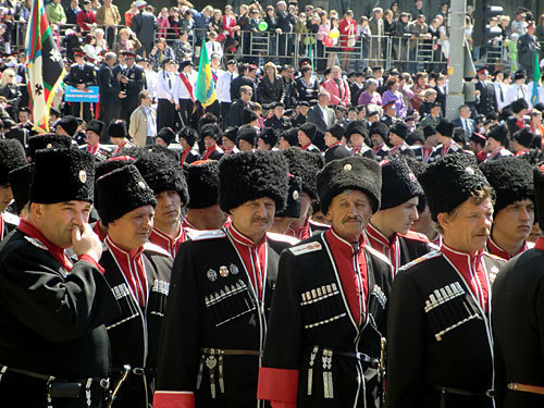 В этом году традиционный казачий парад был посвящен и еще одной дате - юбилею Великой Победы. Поэтому перед началом торжественного марша по площади состоялось возложение гирлянды памяти к Вечному огню на Мемориале павших. Отдать дань погибшим в годы Великой Отечественной войны накануне 65-летия Победы было доверено казакам-ветеранам Илье Лазареву и Николаю Волику и двум краснодарским кадетам Виктору Архипову и Виктору Гущину.