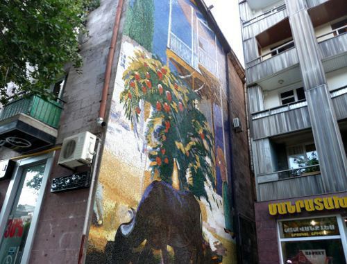 Например, на фасаде одного из зданий - по улице Московяна, 36 - изображена картина знаменитого армянского художника ХХ века Мартироса Саряна ''Мой двор'', рассказали корреспонденту "Кавказского узла" в управлении по информации и связям с общественностью мэрии города Еревана.
