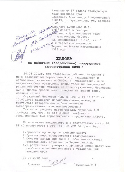 Жалоба начальнику 17 отдела прокуратуры Красноярского края А.В. Слесареву по факту обнаружения у осужденного А. Черкесова телесных повреждений