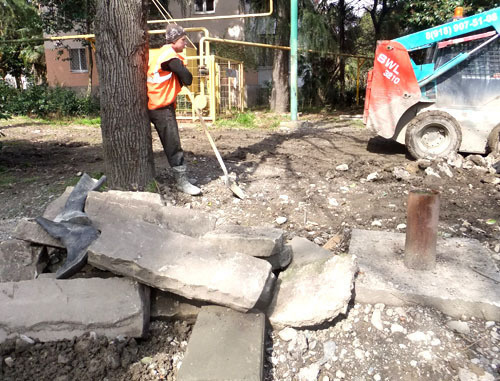 Продукцию из низкокачественного бетона привозят на улицы города для укладки. Сочи, 10 апреля 2012 г. Фото Светланы Кравченко для "Кавказского узла"Работа по замене бордюров ведется в Сочи в рамках программы благоустройства города. Жители Цветного бульвара показали корреспонденту "Кавказского узла" уложенные 2 апреля новые бордюры, которые полностью развалились буквально на следующий день.