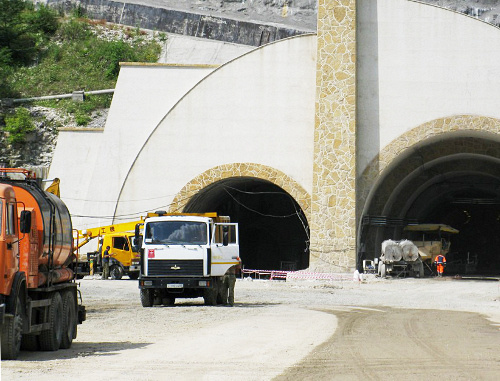 Корреспондент «Кавказского узла» проехал от северного портала тоннеля к южному и обратно. Вся дорога длиной более 4 км заасфальтирована, стены туннеля покрашены. Рабочие вели установку систем освещения, в разных частях тоннеля стояли асфальтоукладчики.