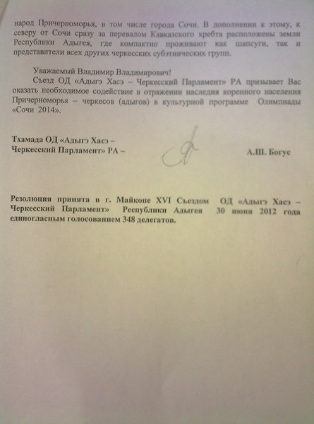 Обращение съезда ОД "Адыгэ Хасэ - Черкесский парламент" Республики Адыгея к Президенту РФ Путину В.В. в связи с подготовкой Олимпиады в Сочи