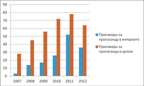До 2008 года количество приговоров за пропаганду именно в интернете было единичным. Скажем, в 2007 году нам были известны всего три таких приговора (из 28 приговоров по ст.ст. 280 и 282 УК в целом). В 2008 году приговоров "за интернет" было вынесено уже 14 (из 45), в 2009-м – 17 (из 56), в 2010-м – 26 (из 72), а в 2011 году количество приговоров увеличилось почти в два раза: их было вынесено не менее 52 (из 78). То есть можно сказать, что "экстремистская пропаганда" преследуется теперь преимущественно в интернете. В 2012 году эта тенденция получила развитие: за первые полгода было вынесено не менее 18 приговоров (из 32).