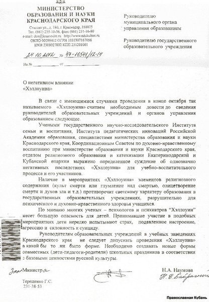 О негативном влиянии "Хэллоуина". Письмо Министерства образования и науки Краснодарского края