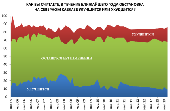 Лев Гудков (Л.Г.): Можно уверено говорить о причине колебаний весной 2008 года. Тогда началось резкое усиление антигрузинской риторики в СМИ, начали говорить об усилении напряженности на Северном Кавказе. Поскольку на телевидении стали об этом говорить, это привело к серьезному изменению настроений. Что кается остальных колебаний, которые не особенно велики, то говорить об их причинах достаточно сложно, поскольку колебания вызваны  целым рядом факторов, и далеко не все из них мы можем знать. Вообще после Чеченской войны обстановку в регионе воспринимают как рутинно-напряженную, поскольку из региона поступают в основном сообщения о терактах и спецоперациях.