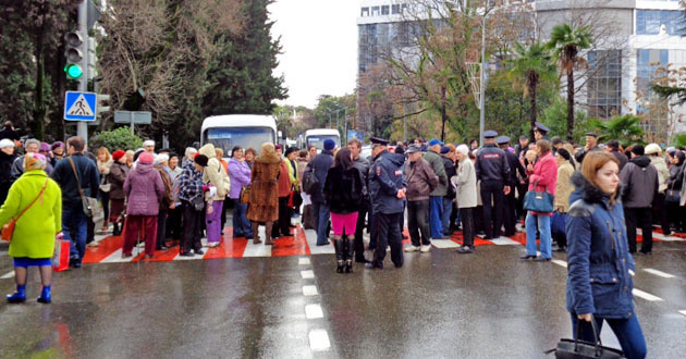 Группа сочинских пенсионеров перекрыла улицу рядом с мэрией, требуя вернуть льготные проездные на общественный транспорт.