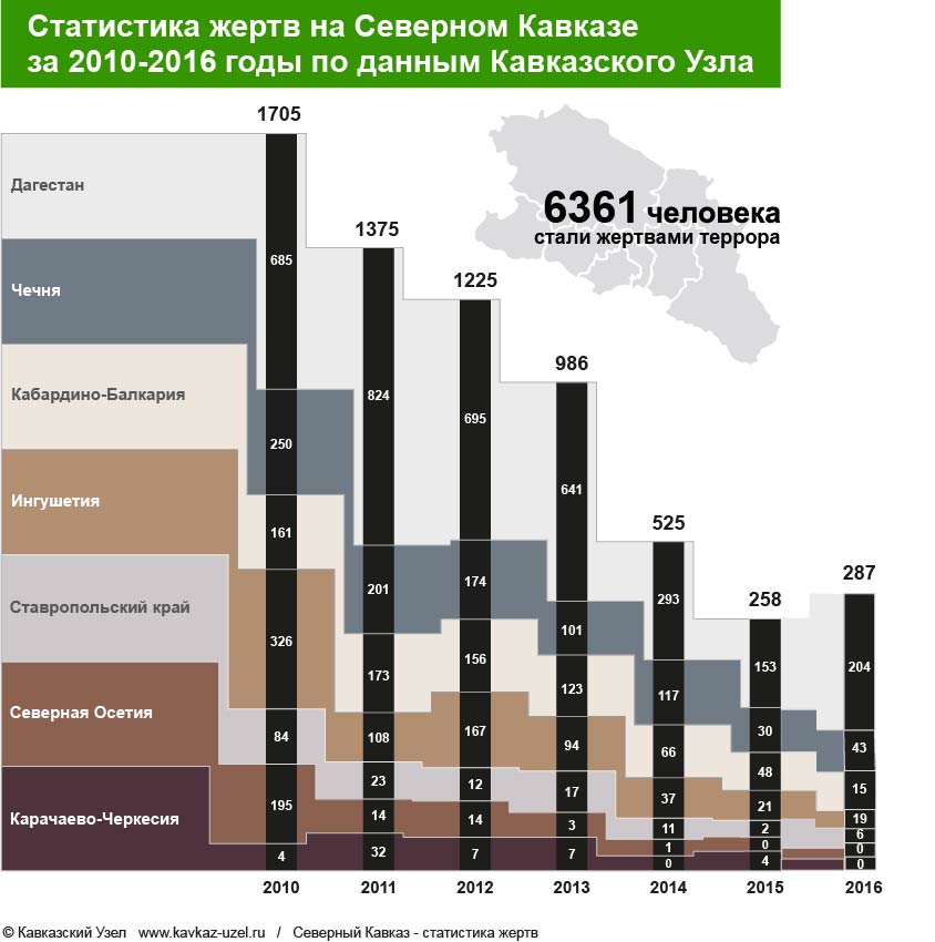 "Кавказским узлом" подготовлена интерактивная инфографика по категориям жертв за 2010-2016 годы, основанная на собственных данных и информации из открытых источников. При клике мышкой на каждую цифру можно увидеть в центре круга распределение жертв по категориям: силовики, боевики, мирные жители.