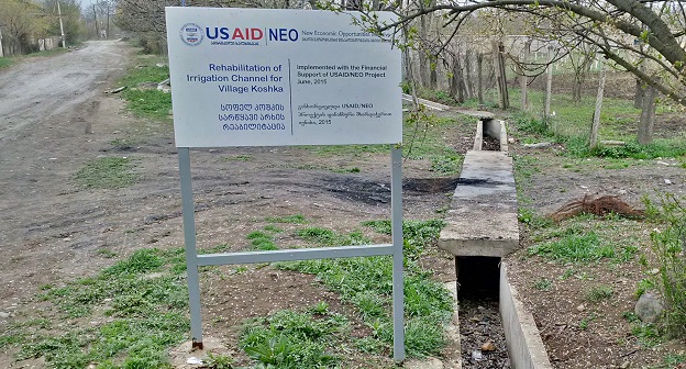 Корреспондент "Кавказского узла" обратил внимание на ирригационные сооружения, проведенные в село Кошка, судя по информационному стенду, за счет проекта USAID, а не правительства Грузии.