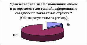 Несмотря на приведенную выше картину, свидетельствующую о сравнительно высокой степени интереса к информации о соседних странах, по солидарному признанию подавляющего большинства всех опрошенных журналистов, нынешний объем доступной информации неудовлетворителен. Так ответили по 80% журналистов из Армении и Азербайджана и все опрошенные из Грузии. 5 армянских и столько же азербайджанских журналистов удовлетворяет нынешний уровень доступа к информации о соседях.