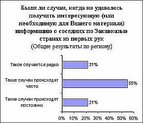 Подавляющая часть журналистов утверждают, что у них были случаи, когда не удавалось получить информацию о соседних странах из первых рук. Причем, больше половины опрошенных подчеркивают, что такое случается часто (55%). Количество же журналистов, заявивших, что неудачные попытки получить эксклюзив бывают постоянно, или наоборот, редко, одинаковое (так ответили по 21% опрошенных). Стоит подчеркнуть: утверждавшие, что им постоянно или часто не удается получить информацию из первых рук, указывают на две причины. На невозможность прямых контактов с деятелями соседних стран указали 72% журналистов из Армении, 68% из Грузии, 60% из Азербайджана. О больших расходах на интервью по телефону с источником информации из соседней страны высказались 44% журналистов из Азербайджана, 40% из Грузии и 24% из Армении. Определенную часть составили опрошенные, которые одновременно упомянули обе эти причины.