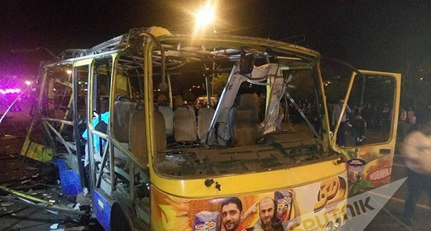 Как писал "Кавказский узел", 25 апреля в 21:51 по местному времени (20:51 мск) произошел взрыв в автобусе на улице Алабяна в Ереване. Полиция заявила, что в автобусе сработало взрывное устройство. По данным МЧС республики на 00:38 мск сегодняшнего дня, в результате взрыва погиб один человек, еще семеро госпитализированы с ранениями. Среди пострадавших оказались трое подростков, состояние двоих из них тяжелое.