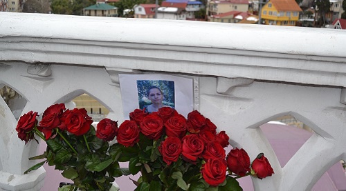 Цветы и фотография Надежды Дегтяревой на Верещагинском мосту в Сочи. 4 февраля 2017 года. Фото Светланы Кравченко для "Кавказского узла"