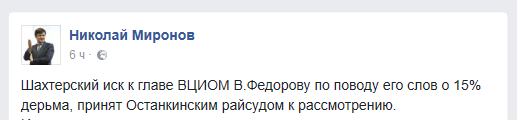 Также сегодня стало известно, что Останкинский районный суд Москвы принял к рассмотрению иск ростовских шахтеров к главе ВЦИОМ Валерию Федорову. Об этом сообщил руководитель Центра экономических и политических реформ Николай Миронов на своей странице в Facebook.