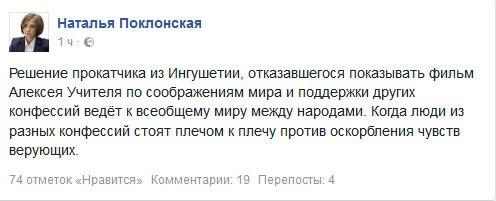 Депутат Госдумы Наталья Поклонская, ставшая инициатором дискуссии о запрете фильма "Матильда", прокомментировала решение ингушского кинопрокатчика. "Решение прокатчика из Ингушетии, отказавшегося показывать фильм Алексея Учителя по соображениям мира и поддержки других конфессий ведет к всеобщему миру между народами", - написала Поклонская сегодня на своей странице в Facebook.