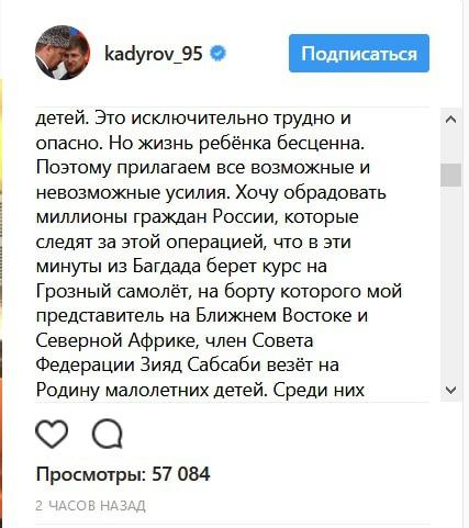 "Мы проводим огромную работу по поиску и возвращению российских детей. (...) Хочу обрадовать миллионы граждан России, которые следят за этой операцией, что в эти минуты из Багдада берет курс на Грозный самолёт, на борту которого мой представитель на Ближнем Востоке и Северной Африке, член Совета Федерации Зияд Сабсаби везёт на Родину малолетних детей (...) Все дети из Дагестана", - отмечается в сообщении, которое было опубликовано 2 часа назад, согласно информации на странице в соцсети на 15.20 мск.