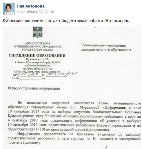 Местные чиновники активно используют административный ресурс, давят на бюджетников, требуя отчитываться об участии в выборах 8. Например, управление образования администрации Анапы почти открыто потребовало от руководителей учреждений допобразования отчитаться о явке на предстоящие выборы.