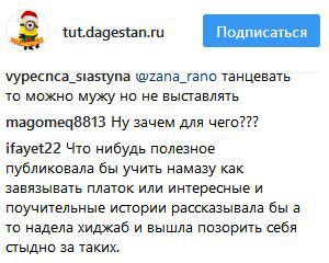 "Что-нибудь полезное публиковала бы: учить намазу, как завязывать платок или интересные и поучительные истории рассказывала бы, а то надела хиджаб и вышла позорить себя, стыдно за таких", - прокомментировал пользователь ifayet22.