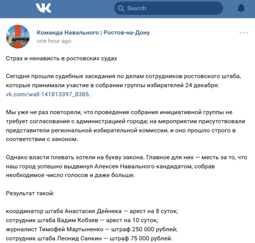 Как сообщал "Кавказский узел", 28 декабря 2017 года полицейские и сотрудники центра "Э" пришли в ростовский штаб Навального и составили административные протоколы на пятерых сторонников оппозиционера, им было вменено проведение несогласованного собрания в поддержку выдвижения Навального в президенты. 17 января двое активистов были оштрафованы, а 18 и 19 января протоколы за участие в этой акции получили еще четверо активистов.