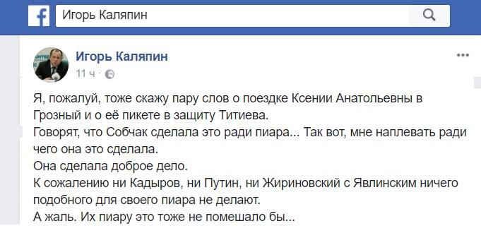 "Я, пожалуй, тоже скажу пару слов о поездке Ксении Анатольевны в Грозный и о её пикете в защиту Титиева. Говорят, что Собчак сделала это ради пиара... Так вот, мне наплевать ради чего она это сделала. Она сделала доброе дело", - написал сегодня Игорь Каляпин на своей странице в Facebook.