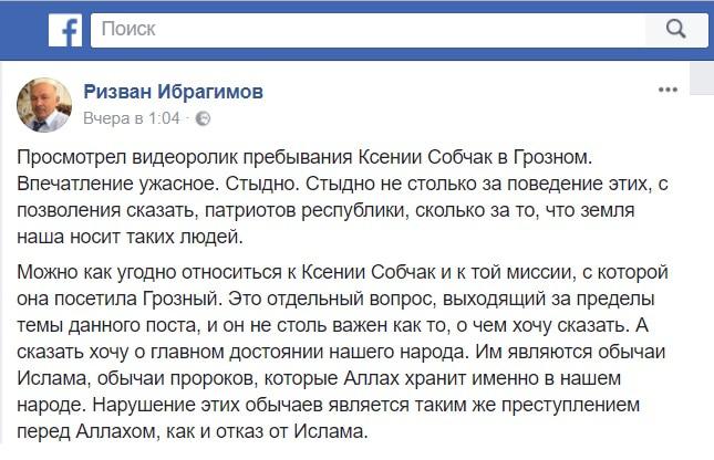 "Ксения Собчак была гостьей нашей республики, Ксения Собчак является женщиной. Она никого не оскорбляла, не нарушала порядок и даже не повышала голос. В отличие от этих горе-патриотов, она повела себя сдержанно и достойно", - написал Ибрагимов 29 января на своей странице в Facebook.