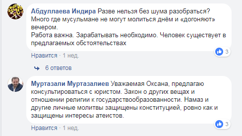 "Закон о других вещах и отношении религии к государствообразованности. Намаз и другие личные молитвы защищены конституцией, ровно как и защищены интересы атеистов", - возразил ей Муртазали Муртазалиев. "Разве нельзя без шума разобраться? Много где мусульмане не могут молиться днём и "догоняют" вечером. Работа важна. Зарабатывать необходимо. Человек существует в предлагаемых обстоятельствах", - попыталась примирить спорщиков Абдуллаева Индира. После того, как пользователи оставили 190 комментариев под постом, его автор в тот же день отключила возможность писать под ним свои мнения.