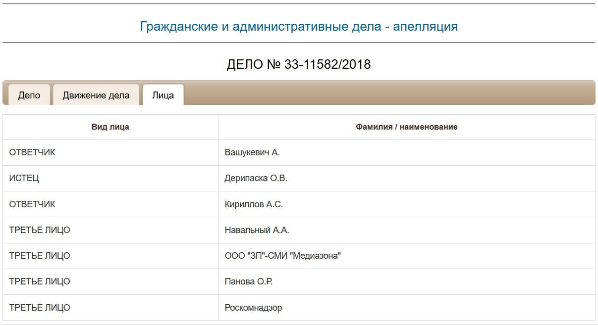 "В качестве третьих лиц к делу, кроме Роскомнадзора, привлечены Алексей Навальный, Оксана Панова (главред Znak.com), а также ООО "ЗП" - СМИ "Медиазона", - цитирует представителя Краснодарского краевого суда "Интерфакс".