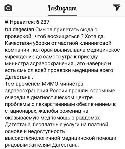 "Мимо министра здравоохранения прошли огромные очереди в диагностическом центре, проблемы с лекарственным обеспечением в стационарах, жалобы рожениц на оказываемую помощь в роддомах Дагестана, бесплатные услуги на платной основе и недоступность высокотехнологичной помощи рядовым жителям Дагестана", - заявил автор публикации на странице закрытой группы tut.dagestan в Instagram.