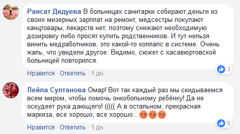 "В больницах санитарки собирают деньги из своих мизерных зарплат на ремонт, медсестры покупают канцтовары, лекарств нет, поэтому снижают необходимую дозировку либо просят купить родственников. И тут нельзя винить медработников, это какой-то коллапс в системе. Очень жаль, что увидели другое", - написал пользователь Раисат Дидуева.