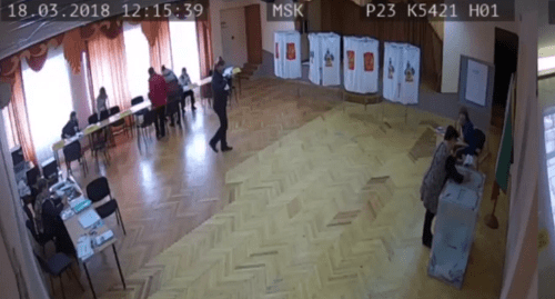 Вброс бюллетеней был произведен на участке №5421 на Звездной улице в Туапсе в 12.15 мск 18 марта, указал автор сообщения, представившийся членом избирательной комиссии. Номер участка и время событий отмечены и на видеокадрах.