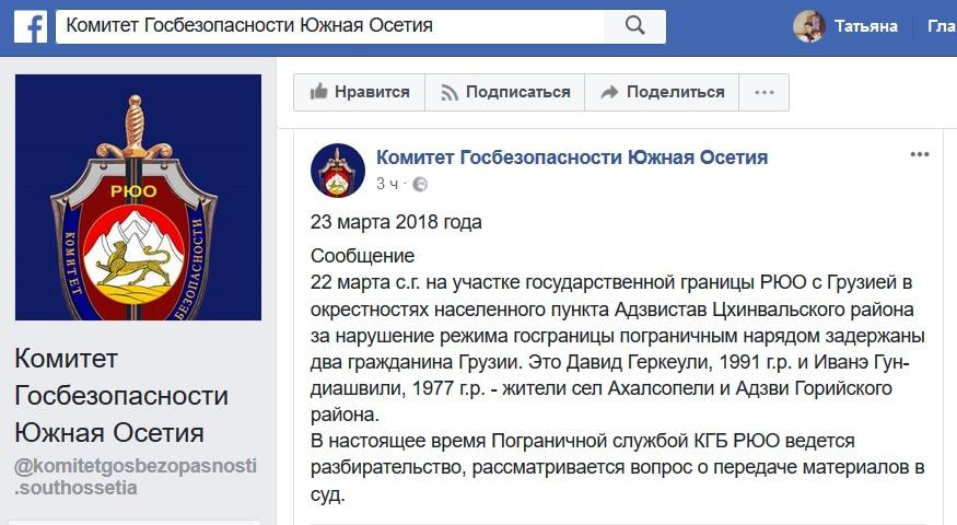 "22 марта на участке государственной границы РЮО с Грузией в окрестностях населенного пункта Адзвистав Цхинвальского района за нарушение режима госграницы пограничным нарядом задержаны два гражданина Грузии. Это Давид Геркеули, 1991 года рождения, и Иванэ Гун-диашвили, 1977 года рождения, - жители сел Ахалсопели и Адзви Горийского района. В настоящее время пограничной службой КГБ Южной Осетии ведется разбирательство, рассматривается вопрос о передаче материалов в суд", - говорится в сегодняшнем сообщении на странице КГБ Южной Осетии в Facebook.