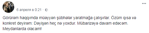 6 апреля в 00.21 на своей странице в Facebook девушка оставила следующий пост: "Вижу, стараются создать определенные подозрения в отношении меня. Я говорю коротко и конкретно: ничего не поменялось. Продолжу борьбу. Буду на площадях".
