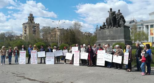 Митинг прошел 29 апреля в Краснооктябрьском районе Волгограда у театра "Царицынская опера" с 11.00 мск до 12.00 мск. Акция была согласована с властями на 60 человек, столько же приняли в ней участие, сообщила корреспонденту "Кавказского узла" организатор митинга Татьяна Степаненко.