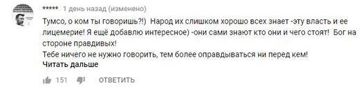 «Тумсо, о ком ты говоришь? Народ их слишком хорошо всех знает - эту власть и ее лицемерие! Я ещё добавлю интересное - они сами знают, кто они и чего стоят! Бог на стороне правдивых! Тебе ничего не нужно говорить, тем более оправдываться ни перед кем! […] Твоих единомышленников много, очень много, они повсюду!»- прокомментировал видео Тумсо Абдурахманова от 3 мая пользователь под ником *****.