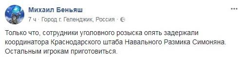 Кроме Чирикова в Краснодаре задержан и координатор местного штаба Навального. "Только что сотрудники уголовного розыска опять задержали координатора Краснодарского штаба Навального Размика Симоняна", - написал сегодня в 12.41 мск на своей странице в Facebook адвокат Михаил Беньяш.
