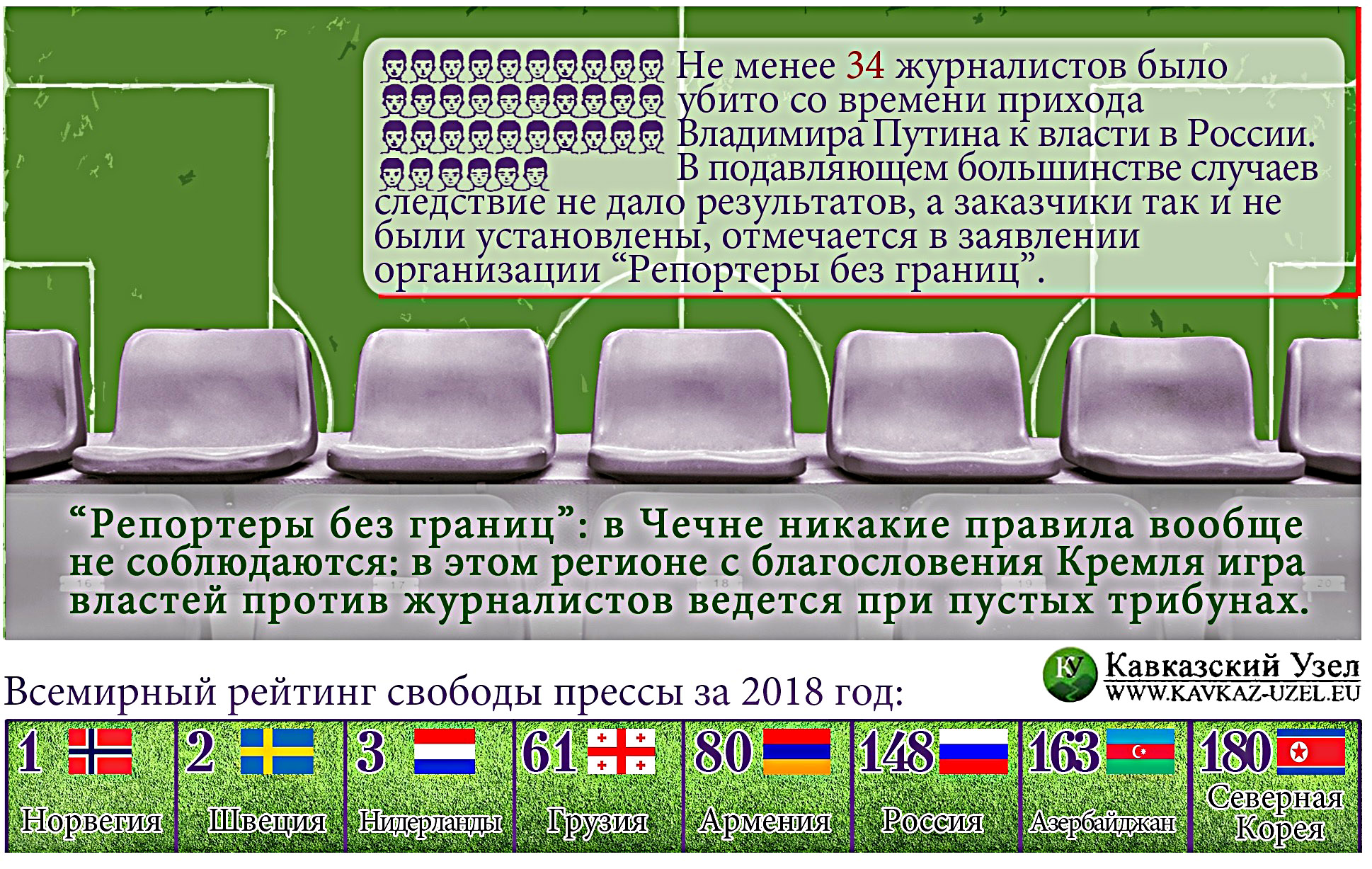 "Репортеры без границ" по итогам 2016 года поместили Россию в своем "Индексе уровня свободы прессы в мире" на 148-е из 180 мест, причем Чечня была названа "черной дырой для новостей". В организации отмечали, что в стране свободы для выражения мнений стало меньше, чем в любое другое время со времен распада Советского Союза. Россия занимает 148-е место из 180 во всемирном рэнкинге свободы прессы за 2018 год, опубликованном РБГ в 2018 году.
