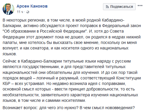 Существующая практика, согласно которой в Кабардино-Балкарии титульные языки наряду с русским являются государственными и для представителей титульных национальностей обязательны для изучения, - "логичный и разумный" порядок вещей, написал минувшей ночью на своей странице в Facebook Арсен Каноков.