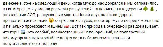 Она сообщила, что в поселке, который оказался отрезанным от цивилизации, была паника, и местные жители начали скупать в магазине хлеб и муку. "Мы же поспешили в отделение МЧС, которое записывало всех на вертолётную эвакуацию. Однако всё обошлось благополучно, дорогу кое-где сумели подсыпать и восстановить хоть какое-то движение. Уже на следующий день, когда муж до нас добрался и мы отправились в Пятигорск, мы увидели размеры разрушений - выкорчеванные деревья, поваленные ЛЭП, разрушенные мосты. Новая двухполюсная дорога превратилась в жалкий обгрызенный кусок, по которому по очереди медленно и печально проезжают машины", - рассказала Елена Звягина.