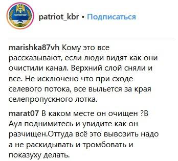 "В каком месте он очищен? В аул поднимитесь и увидите, как он расчищен. Оттуда всё это вывозить надо, а не раскидывать и тромбовать, и показуху делать", - заявил в ходе дискуссии в группе patriot_kbr пользователь с ником marat07.