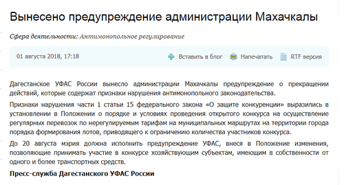 На сайте мэрии Махачкалы по состоянию на 21:00 мск нет комментариев относительно вынесенного антимонопольной службой предупреждения.