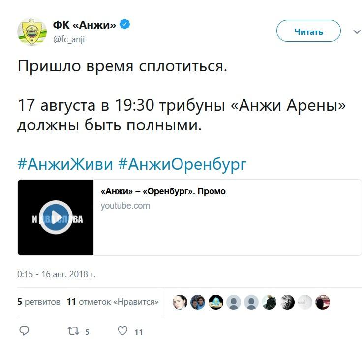 В официальном аккаунте "Анжи" в соцсети Твиттер 16 августа был опубликован призыв к болельщикам "сплотиться". "Пришло время сплотиться. 17 августа в 19:30 трибуны "Анжи Арены" должны быть полными", - говорится в сообщении.