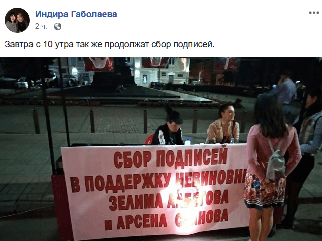 "Завтра с 10.00 утра также продолжат сбор подписей", - написала сегодня на своей странице в Facebook жительница Владикавказа, бывшая сотрудница республиканского МВД Индира Габолаева.
