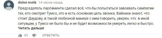 "Председатель парламента сделал все, чтобы попытаться завоевать симпатии тех, кто смотрит Тумсо, это и есть основная цель звонка. Вайнахи знают, что стоит Даудову в такой любезной манере с ним говорить, уверен, что в иной ситуации у Тумсо не было бы и не будет возможности умереть легко и быстро", - написал dishni mohk.