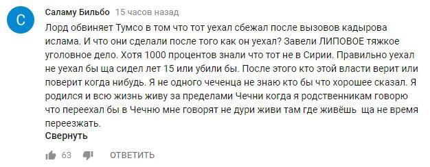 "Лорд обвиняет Тумсо в том, что тот уехал, сбежал после вызовов Кадырова Ислама. И что они сделали после того, как он уехал? Завели ЛИПОВОЕ тяжкое уголовное дело. Хотя 1000 процентов знали, что тот не в Сирии. Правильно уехал, не уехал бы, ща сидел лет 15 или убили бы. После этого кто этой власти верит или поверит когда-нибудь. Я ни одного чеченца не знаю, кто бы что хорошее сказал. Я родился и всю жизнь живу за пределами Чечни, когда я родственникам говорю, что переехал бы в Чечню, мне говорят, не дури, живи там, где живёшь, ща не время переезжать", - написал Саламу Бильбо.