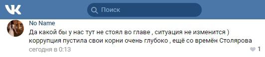 "Да какой бы у нас тут не стоял во главе, ситуация не изменится. Коррупция пустила свои корни очень глубоко ещё со времен Столярова",- написал No Name в соцсети "ВКонтакте".
