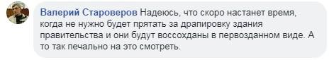«Надеюсь, что скоро настанет время, когда не нужно будет прятать за драпировку здания правительства, и они будут воссозданы в первозданном виде. А то так печально на это смотреть», - написал 28 сентября Валерий Староверов под видео о репетиции парада в группе «Абаза (Апсуа)- Адыгский(Черкесский) Мир» в Facebook.