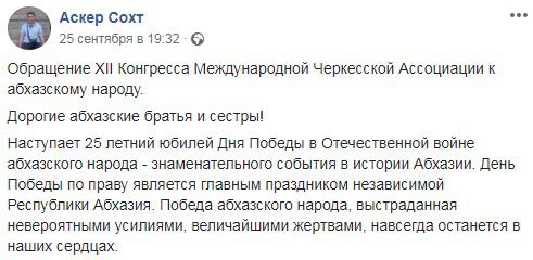 Зампредседателя "Адыгэ Хасэ" Краснодарского края Аскер Сохт выложил на своей странице в Facebook обращение XII Конгресса Международной Черкесской Ассоциации к абхазскому народу по случаю Дня независимости. «В этот день мы вспоминаем лучших сынов Абхазии и добровольческое движение Северного Кавказа, многих иных регионов России и зарубежья, вставших на защиту Абхазии. Многие из них отдали самое ценное - свои жизни ради мира на абхазской земле, процветания нынешнего и будущих поколений народа Абхазии», - говорится в обращении.